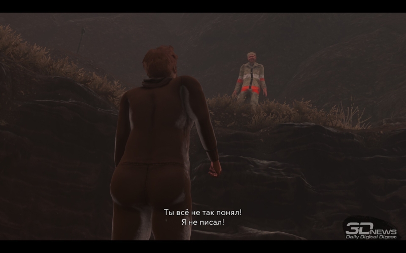Но хотя навыки протагониста не меняются, сам он удивительным образом меняется — хотя поначалу это кажется чем-то более неожиданным, нежели возможность, к примеру, отрастить себе двойной прыжок (нет, даже одинарного не будет, не надейтесь). Тональность Baby Steps поначалу очевидна, как очевидна она была еще в момент первого трейлера — это абсурдная комедия. Причем на всех уровнях: как в игровом процессе (падающие люди — это же классика юмора, так уж мы, люди, устроены), так и в повествовании. Хотя сюжета как такового нет, только набор сценок — иногда связанных последовательно, иногда полностью автономных. Они бывают забавными, бывают дикими, но одно поначалу не меняется — абсолютно запредельный градус абсурда, не предполагающий никакого серьезного разговора внутри игрового мира. Просто иди, плюхайся как идиот, плачь и смотри, как тебя унижают все встречные-поперечные. Ведь ты такой жалкий и все это заслужил.